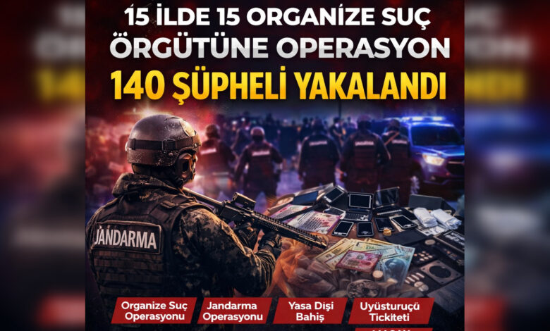 İçişleri Bakanlığı koordinasyonunda, 15 ilde 15 ayrı organize suç örgütüne yönelik son bir haftada düzenlenen operasyonlarda 140 şüpheli yakalandı. Operasyonlar, Cumhuriyet Başsavcılıkları ile Jandarma Genel Komutanlığı KOM, Siber ve Narkotik Suçlarla Mücadele Daire Başkanlıklarının koordinasyonunda, İl Jandarma Komutanlıklarınca gerçekleştirildi.