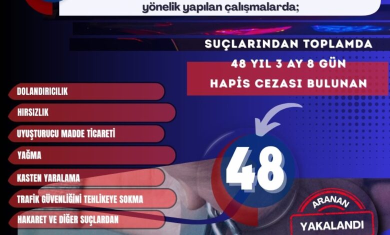 Yakalananlar arasında; “suç işlemek amacıyla kurulan örgüte üye olma” ve “hırsızlık” suçlarından 22 yıl hapis cezası ile “dolandırıcılık” suçundan 7 yıl 4 ay hapis cezası bulunan 2 kişi de yer aldı. Ayrıca yağma, kasten yaralama ve uyuşturucu madde ticareti gibi suçlardan aranan şahısların da yakalandığı bildirildi.